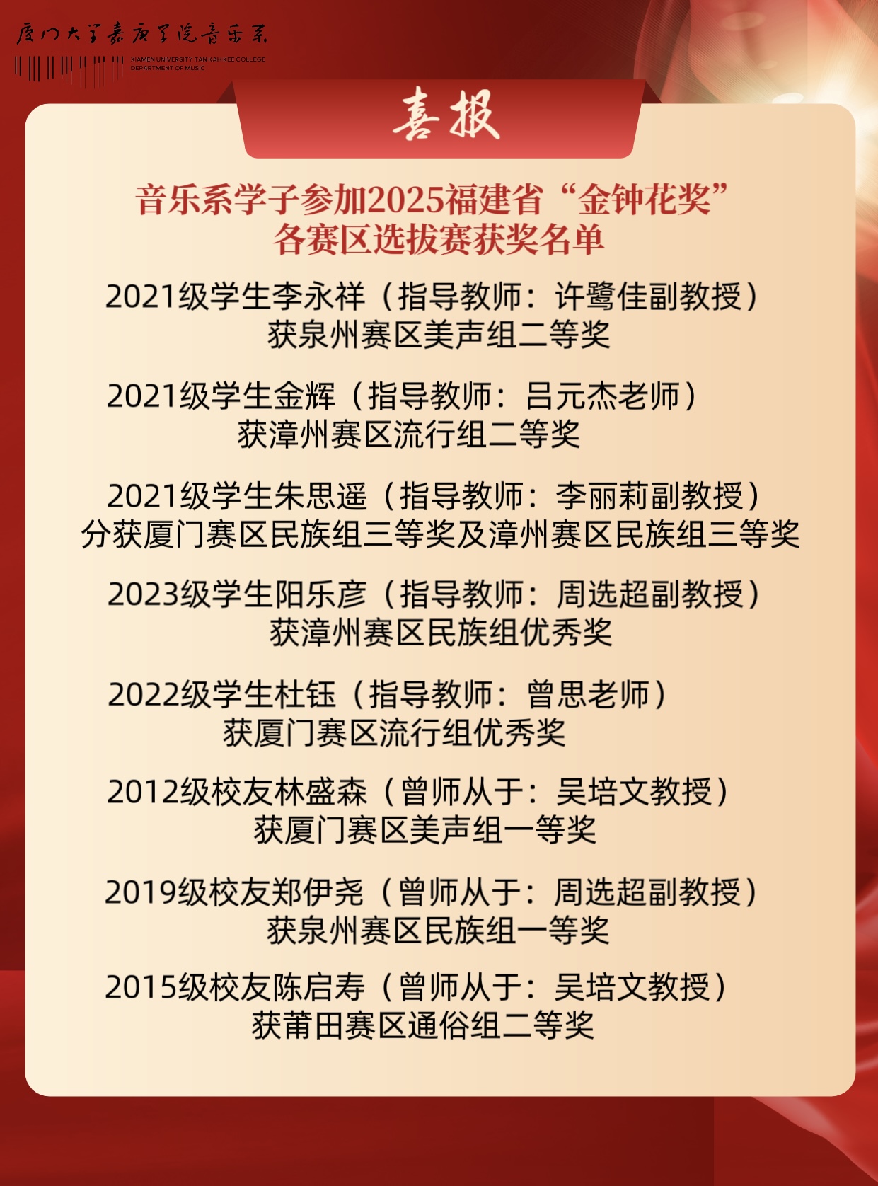 音乐系学子参加2025福建省“金钟花奖”各赛区选拔赛获奖名单