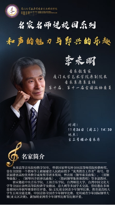 音乐会 名家名师进校园系列----李未明《和声的魅力与即兴的乐趣》 2022级舞蹈表演专业毕业晚会 2025福建省高雅艺术进校园系列活动 热烈庆祝厦门大学嘉庚学院音乐与舞蹈学院成立 吴少嘉本科毕业钢琴独奏音乐会 视频影音 更多 新闻报道 更多 青春歌韵传经典 学子风采耀鹭岛 ——我院在厦门市青少年儿童歌手赛斩获佳绩 厦门大学嘉庚学院音乐与舞蹈学院举办“一二九”党团知... 喜报!音乐与舞蹈学院原创肢体剧《坠落之前》双线夺奖... 对接国家特教提升计划,我校携手厦门特殊教育学校共筑... “嘉”讯!音乐与舞蹈学院揭牌成立 音乐系钢琴教研室实践周:在多元体验中读懂音乐的“立... 中共漳州市芗城区委宣传部赴厦门大学嘉庚学院开展林语... 音乐与舞蹈学院唱响《宪法伴我们成长》 压轴思明区“... 和声润心育美 名家领航铸魂——李未明教授讲座绘就嘉庚... 大学课堂“前移”小学讲台——音乐与舞蹈学院&海沧青少... 通知公告 更多 厦门大学嘉庚学院音乐系毕业论文(设计)指导手册 202... 厦门大学嘉庚学院音乐系毕业论文(设计)指导手册 202... 2025届毕业论文(设计)查重检测工作方案 音乐系毕业论文(设计)工作领导小组成员名单(2025年... 厦门大学嘉庚学院音乐系毕业论文(设计)指导手册 音乐系毕业论文(设计)格式参考文档 音乐系毕业论文(设计)工作领导小组成员名单 2024--2025学年第一学期教材选用计划表 厦门大学嘉庚学院音乐系首届五项全能大赛 厦门大学嘉庚学院音乐系舞蹈教研室“舞艺嘉庚杯”首届... 风采之窗 更多 音乐与舞蹈学院 执行院长 廖瑞洁 厦门大学嘉庚学院18级舞蹈表演结业晚会 2018级民乐合奏汇报音乐会 赵纯 洪再添 胡乃君 相关链接 教务部 学校主页 厦门大学 厦门大学艺术学院 音乐系新浪微博